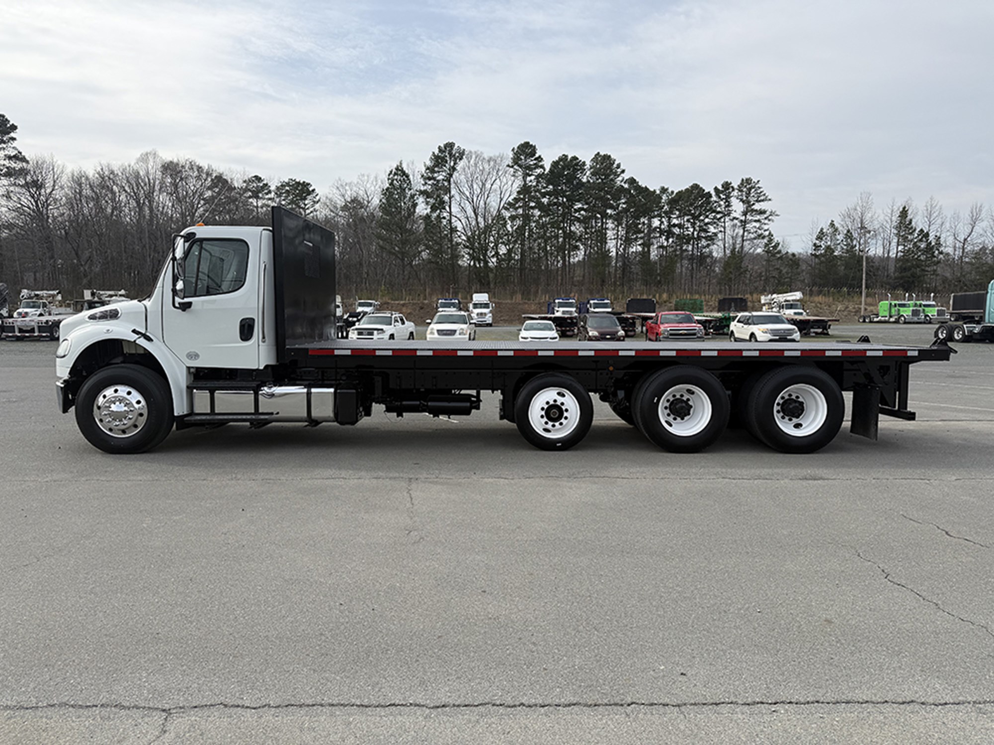 2016 Freightliner M2106 24′ x 102″ Tri Axle Flatbed with Princeton Hookup Cummins ISL 350 HP Allison 3000HS Automatic Transmission 14600# Front 40000# Rear (1) Steerable Lift Axle P/S A/C Tilt Steering Heated Mirrors Double Framed Steel Floor (8) Winches (1) Steel Storage Box 80 Gallon Aluminum Tank. Ask About Our Financing and Warranty Options.
