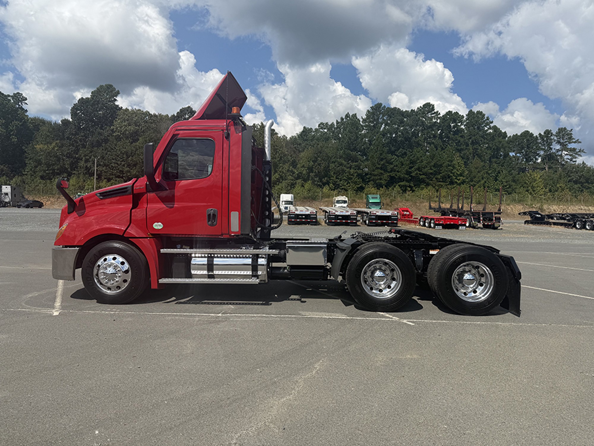 2021 Freightliner Cascadia 126 Tandem Axle Day Cab Detroit DD13 450 HP DT12 Automatic Transmission 14700# Front 40000# Rear 53300# GVWR P/S A/C Power Windows Mirrors and Locks Cruise Dual Hood Mirrors 100 Gallon Aluminum Tank.
